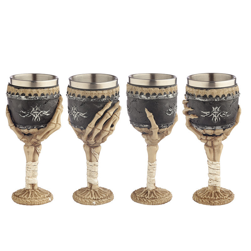 Copo para decoração de mesa de Halloween com mão de caveira.