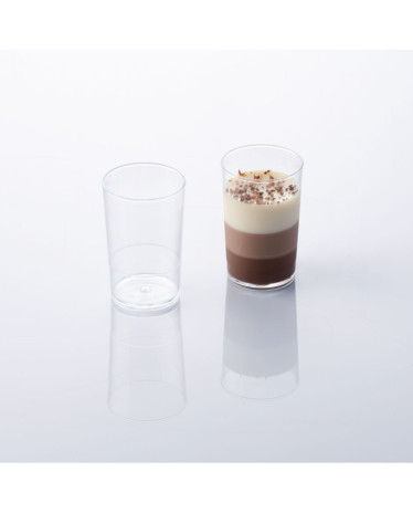 Copo transparente para sobremesas ou entradas com capacidade para 65ml, com cerca de 6.5cm de altura e 4.2cm de diâmetro.