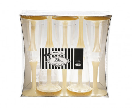 Conjunto de 10 copos de plástico transparentes para champanhe, com pé na cor creme.