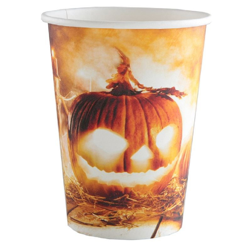Conjunto de 10 copos de papel descartáveis com design terrorífico ideais para noites de Halloween.
