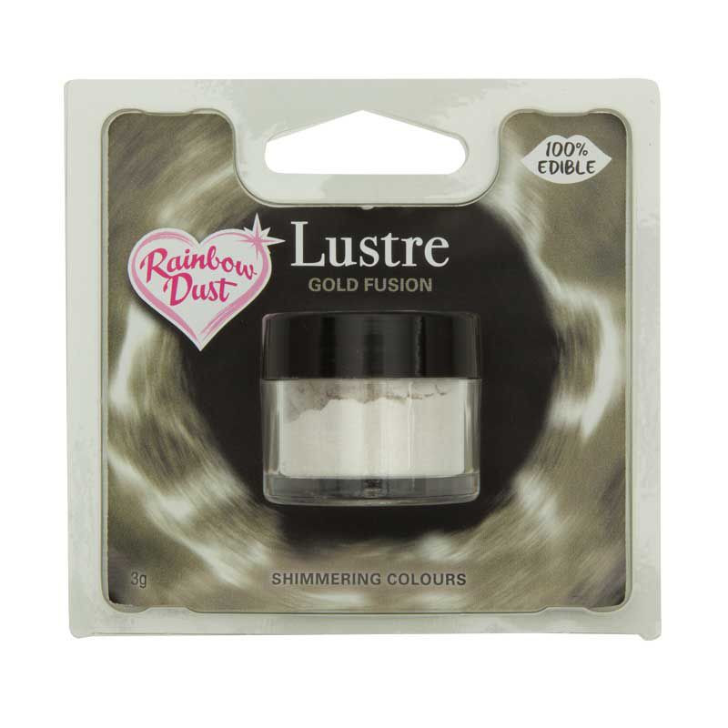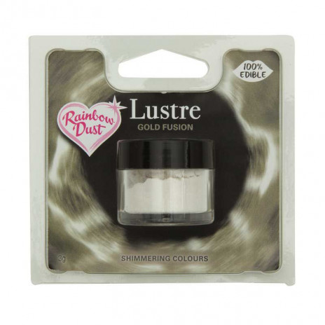 Corante em pó da gama de pós da coleção Lustre, na cor Gold Fusion. Este pó metálico fino exclusivo foi especialmente projetado para criar um belo brilho e lustro. É um produto especialmente adequado para se dissolver em álcool para fazer tintas comestíveis. O produto é 100% comestível.