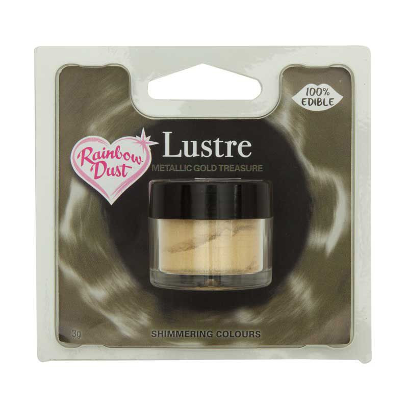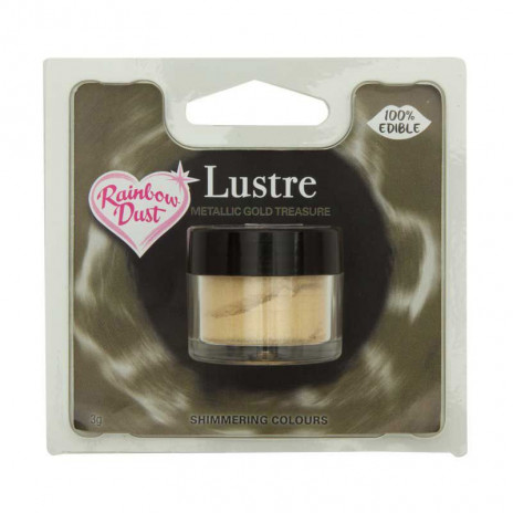 Corante em pó da linha de pós da coleção Lustre na cor gold treasure. Este pó metálico fino exclusivo foi especialmente projetado para criar um belo brilho e lustro. É um produto especialmente adequado para se dissolver em álcool para fazer tintas comestíveis.