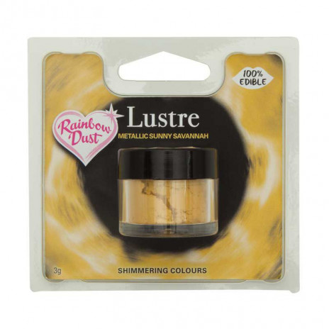 Corante em pó da gama de pós da coleção lustre, na cor Sunny Savannah. Este pó metálico fino exclusivo foi especialmente projetado para criar um belo brilho e lustro. É um produto especialmente adequado para se dissolver em álcool para fazer tintas comestíveis.