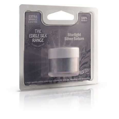 Corante em pó da gama de pós da coleção lustre na cor silver saturn. O pó Starlight é composto por um material básico que proporciona um efeito ainda mais cintilante. É um produto especialmente adequado para se dissolver em álcool para fazer tintas comestíveis. O produto é 100% comestível. Ingredientes: E555, E171 e E153. Conteúdo: 2 a 4 gramas.