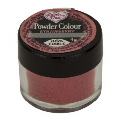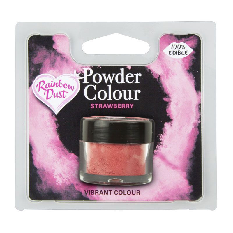 O vermelho morango é uma das várias cores de pó fino da gama Powder Color da Rainbow Dust. Eles também podem ser dissolvidos em álcool para fazer tinta comestível. E o produto é 100% comestível.
