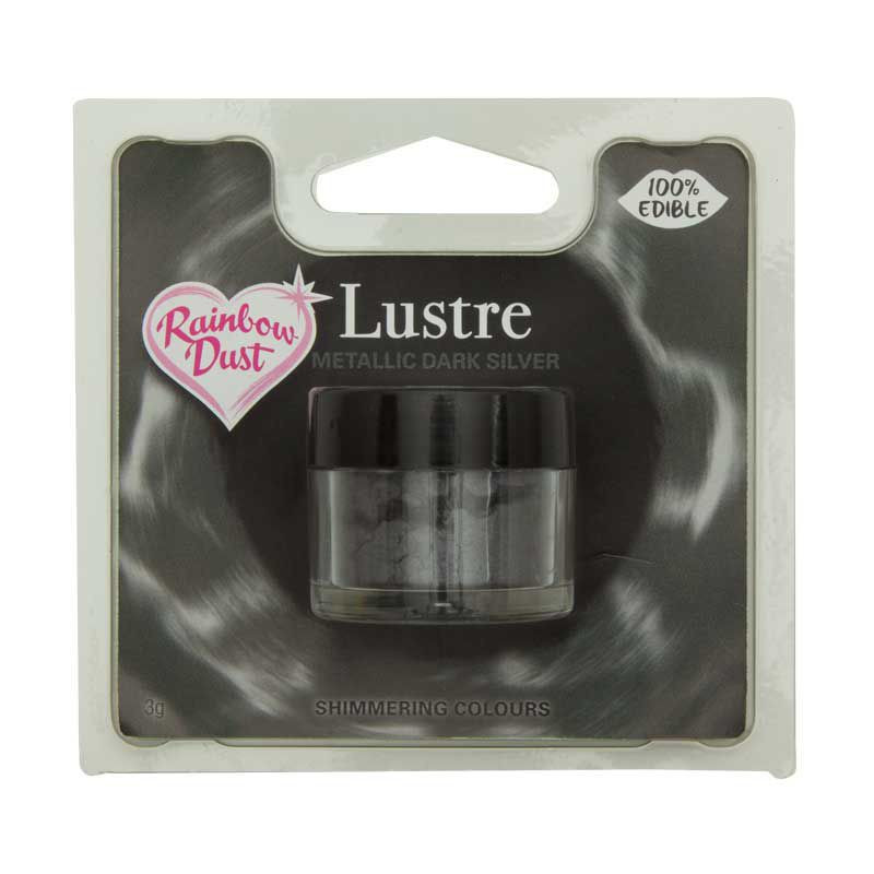 Corante em pó da gama de pós da coleção Lustre, na cor Prata Escura. Este pó metálico fino exclusivo foi especialmente projetado para criar um belo brilho e lustro. É um produto especialmente adequado para se dissolver em álcool para fazer tintas comestíveis.