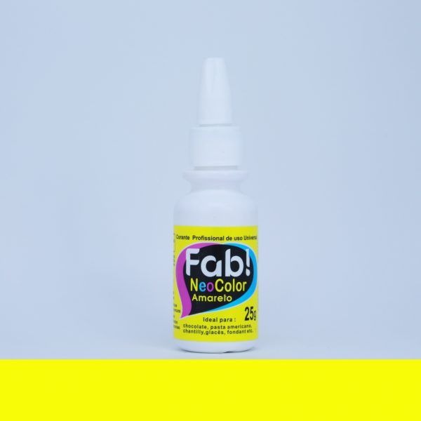 O Corante Neocolor Amarelo da Fab! tem uma tonalidade clara e uma cor viva, diferente da cor amarelo gema da linha do Neocolor da Fab! Inovação no mercado de corantes, o corante Neocolor Fab! Possui funções reunidas de todos os corantes num único produto. Nunca antes fabricado no mundo, a Fab! Juntou os corantes hidrossolúveis e lipossolúveis numa única formula. Possibilitando a aplicação tanto em bases aeradas – Como Chantilly, glacês, chantininho e – Pasta de açúcar, pasta americana, pasta elástica e etc. Agora também em preparações à base de gordura, como chocolates, manteiga comum e manteiga de cacau.