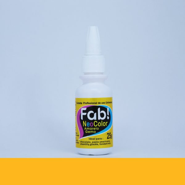 O Corante Neocolor Amarelo Gema da Fab! tem uma cor mais aberta e um pouco mais escura que o corante amarelo. É altamente concentrado. Inovação no mercado de corantes, o corante Neocolor Fab! Possui funções reunidas de todos os corantes num único produto. Nunca antes fabricado no mundo, a Fab! Juntou os corantes hidrossolúveis e lipossolúveis numa única formula. Possibilitando aplicação tanto em bases aeradas – Como Chantilly, glacês, chantininho e – Pasta de açúcar, pasta americana, pasta elástica e etc. Agora também em preparações à base de gordura, como chocolates, manteiga comum e manteiga de cacau.