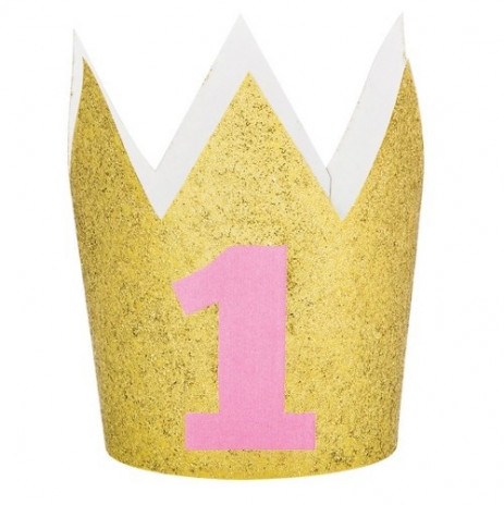 Coroa para o primeiro aniversário em dourado com glitter com o número um em rosa, para a sua menina. Com elástico para prender.