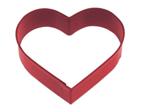 Moldes/cortadores em metal de tom vermelho, para a execução de bolinhos ou bolachas com o formato de coração para as decorações de natal.