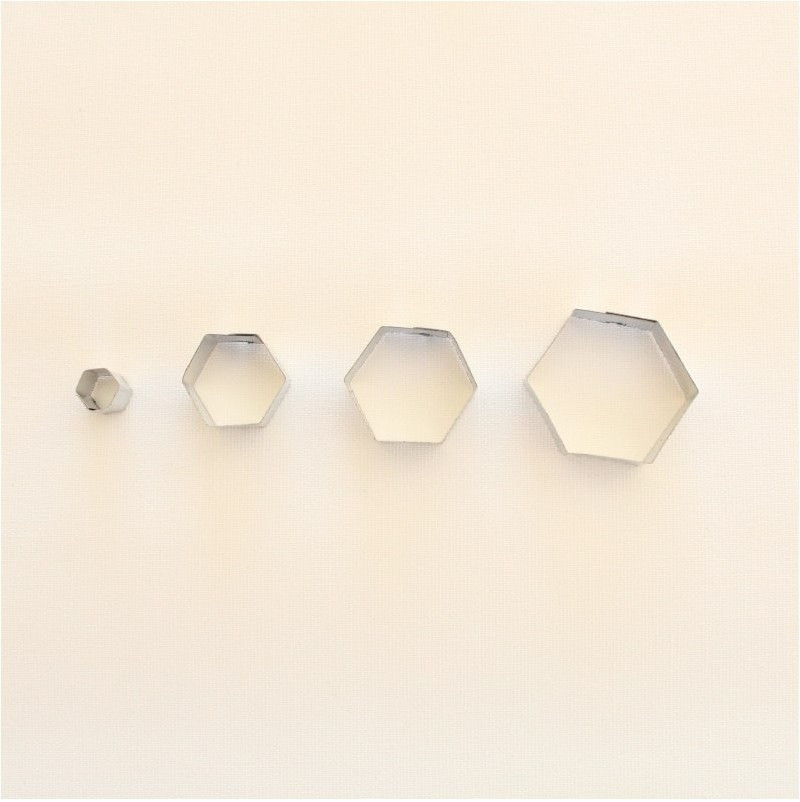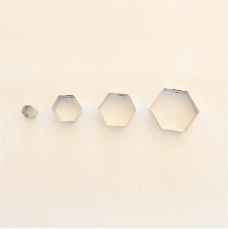 Moldes/cortadores em metal, para a execução de bolinhos com o formato hexagonal.