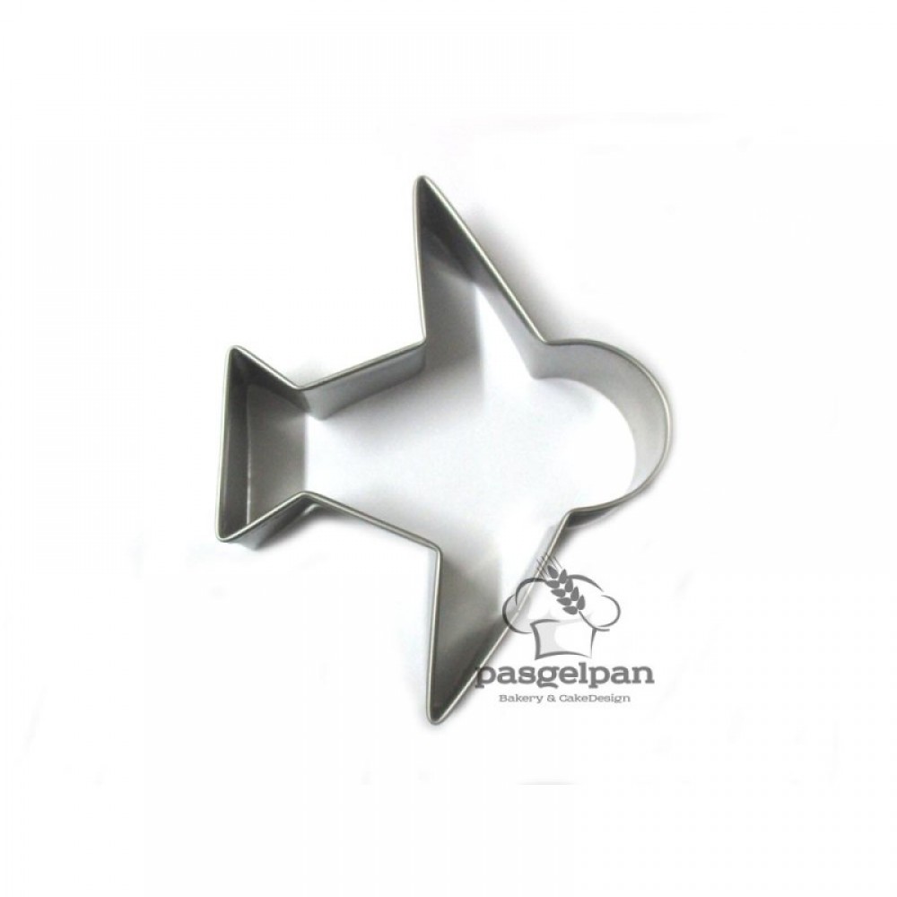Cortador de bolachinhas em alumínio em forma de avião com medidas aproximadas de 9 cm.