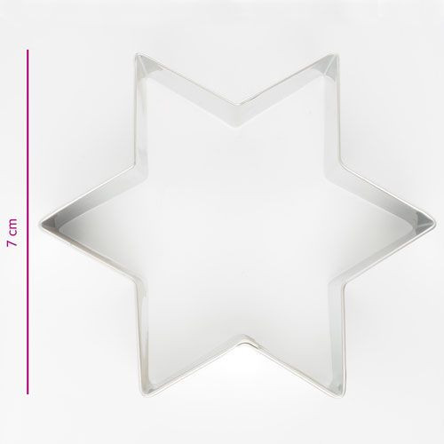 Cortador de bolachinhas em alumínio em forma de estrela com medidas aproximadas de 7 cm x 2,5cm.