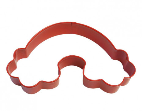 Molde/cortador em metal de tom vermelho, para a execução de bolinhos com o formato de arco íris para festas de aniversário e baby shower.