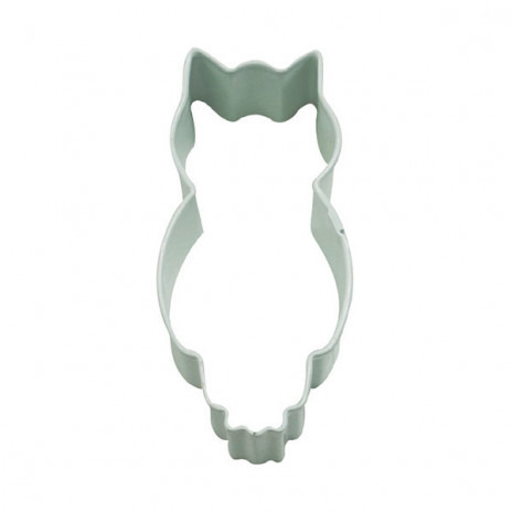 Molde/cortador em metal de tom branco, para a execução de bolinhos com o formato de coruja para festas de aniversário dos animais do bosque ou para o halloween.