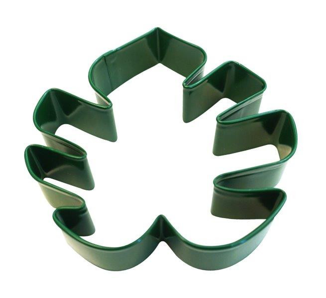 Moldes/cortadores em metal de tom verde, para a execução de bolinhos com o formato de folha para tema de festa da selva ou tropical.