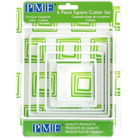 Prático conjunto de 6 cortadores quandrangulares PME, ideais para fazer biscoitos, plascas decorativas e formas simples de flores ideais para decorar todas as suas criações.Ideal para usar com pasta de açúcar, pasta de goma, massas e muito mais.