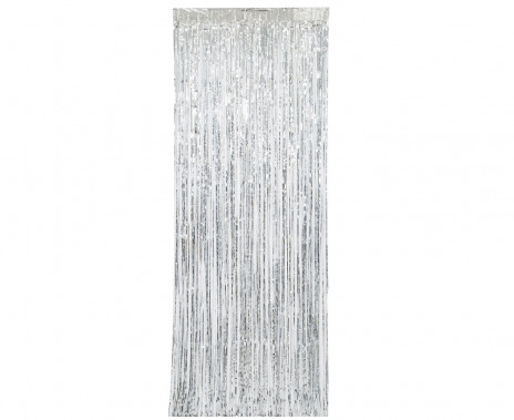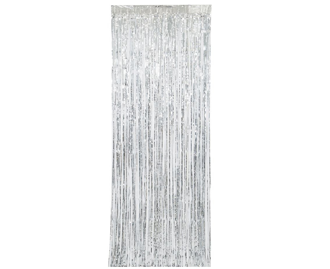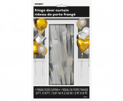 Cortina de festa para porta em prateada, com as medidas 91cm de largura e 243cm de comprimento.