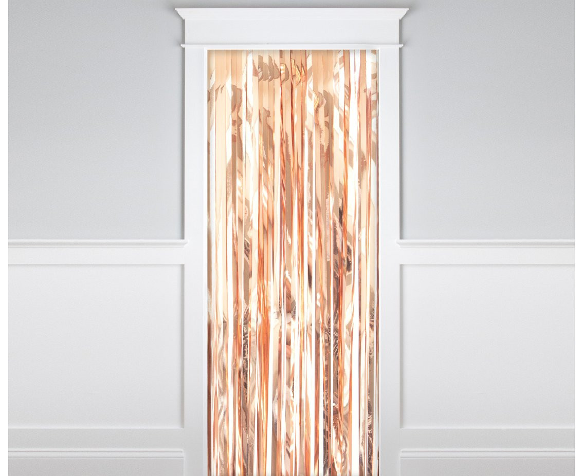Cortina de festa para porta em rose gold, com as medidas 91cm de largura e 243cm de comprimento.
