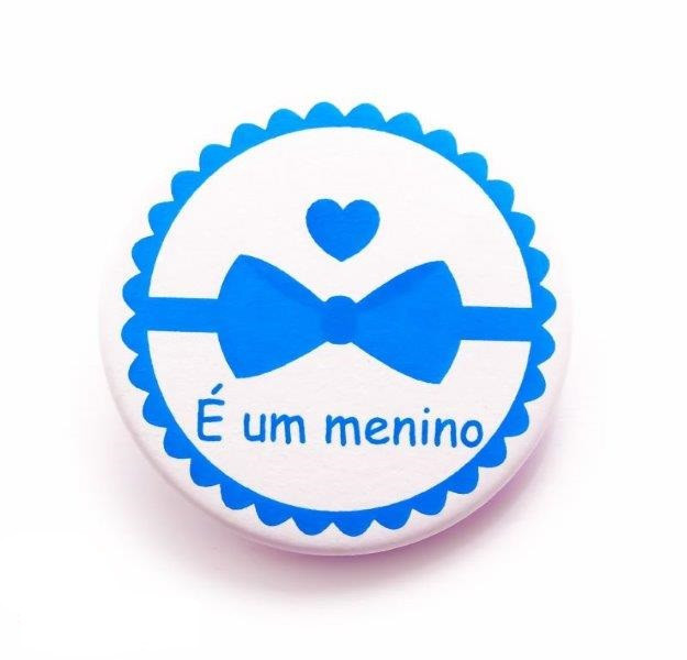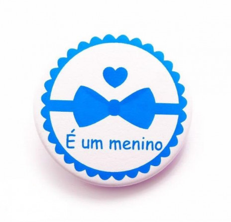 Crachá para festa de baby shower ou chá de revelação para o nascimento de menino. Inclui um crachá de 34mm de diâmetro com alfinete com inscrição "É uma menino". Disponível para menina.