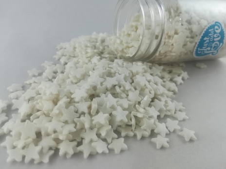 Confetis em forma de estrelinhas brancas para decoração de todo o tipo de bolos, de 55g vendido em frasco de rosca.