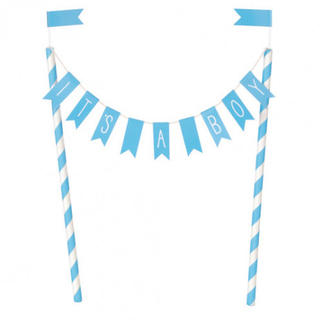 Para embelezar o seu bolo de baby shower, para festejar a vinda do sua bebé, esta decoração com bandeirinhas em azul e branco. Com a inscrição "It's a Boy".