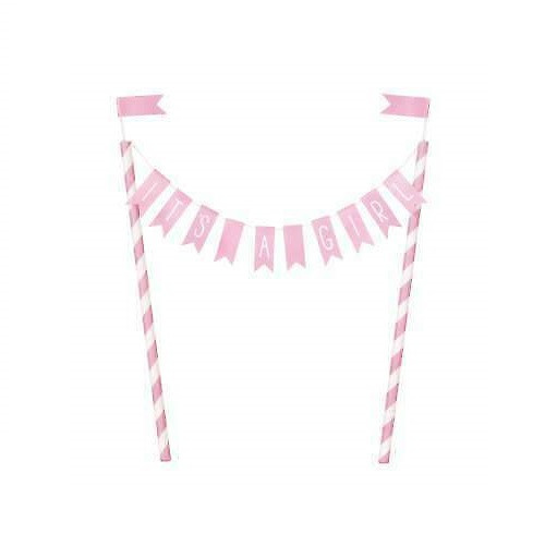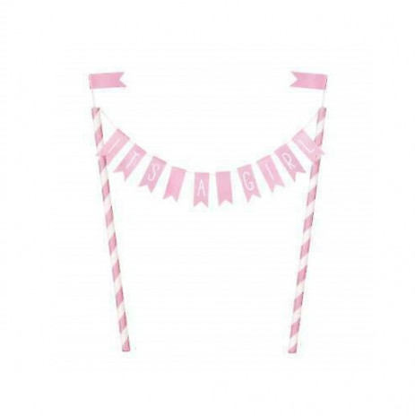 Para embelezar o seu bolo de baby shower, para festejar a vinda da sua bebé, esta decoração com bandeirinhas em rosa e branco. Com a inscrição "It's a Girl".