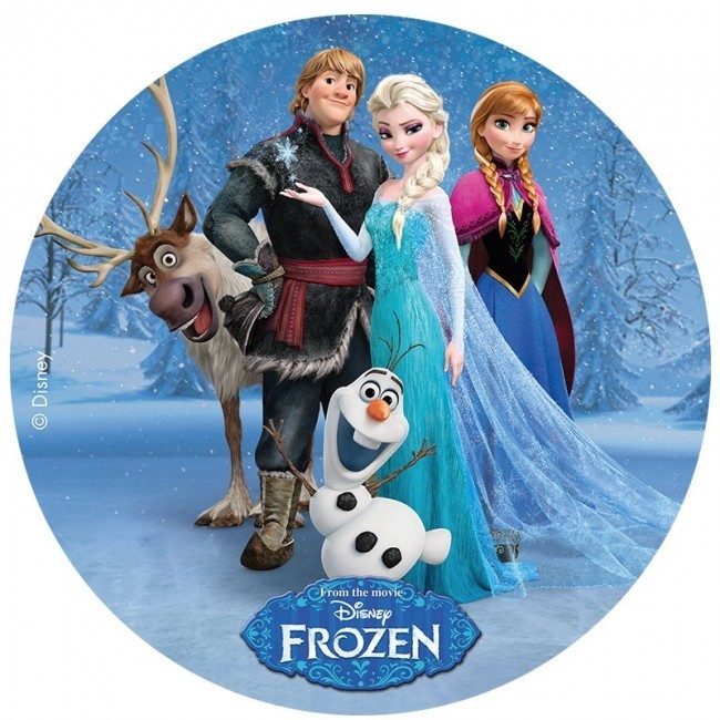 Disco de obreia (hostia) comestível com imagem de todas as personagens Disney Frozen para a decoração do bolo de aniversário. Diâmetro: 20cm de diâmetro.