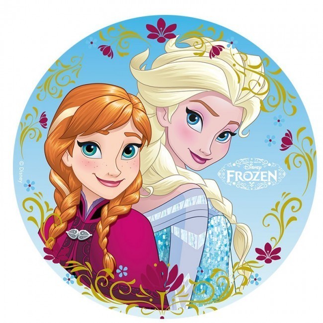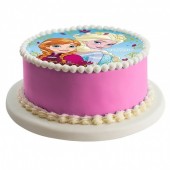 Disco de açúcar (obreia) comestível com imagem das irmãs Elsa e Anna, do filme Disney Frozen para a decoração do bolo de aniversário. Diâmetro: 20cm de diâmetro. Embalagem individual, fechada hermeticamente e própria para uso culinário.
