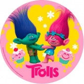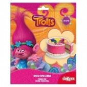 Disco de açúcar (comestível) para a decoração do bolo de aniversário com as conhecidas personagens do filme Trolls com 20cm de diâmetro.
