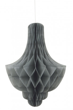 1 candelabro decorativo em papel seda em tom prateado, com 35cm de altura.