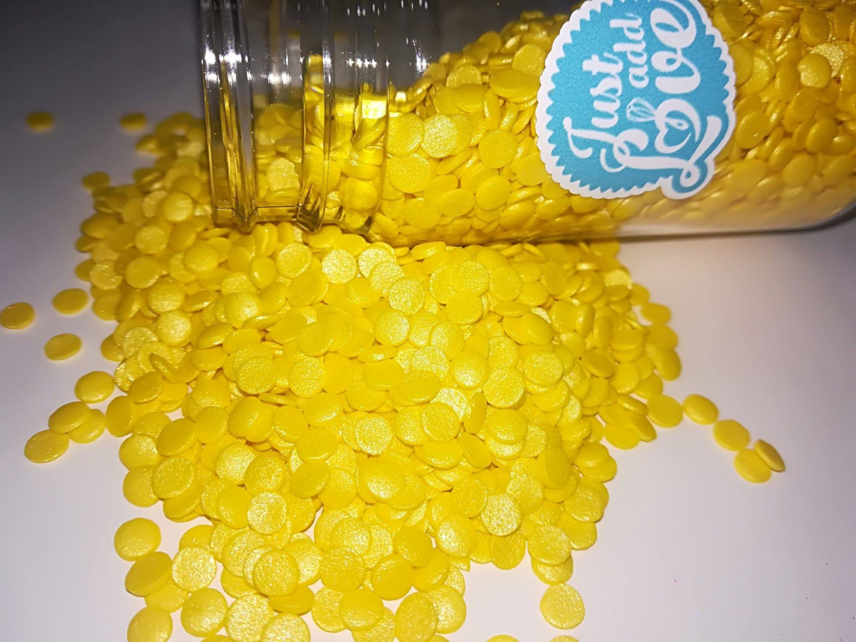 Confettis de cor amarela para decoração de todo o tipo de bolos, de 55g vendido em frasco de rosca.
