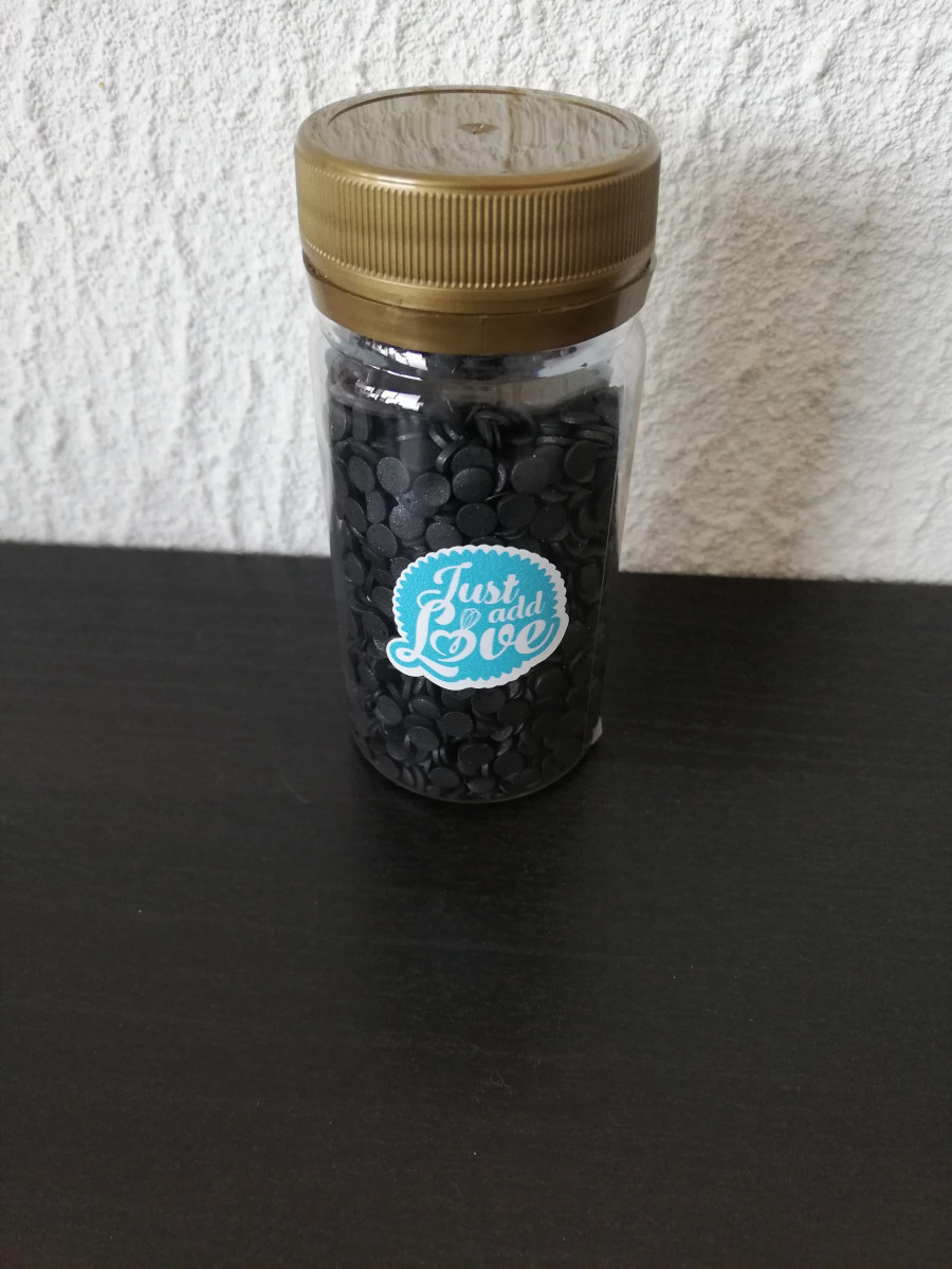 Confettis Preto para decoração de todo o tipo de bolos, de 55g vendido em frasco de rosca.