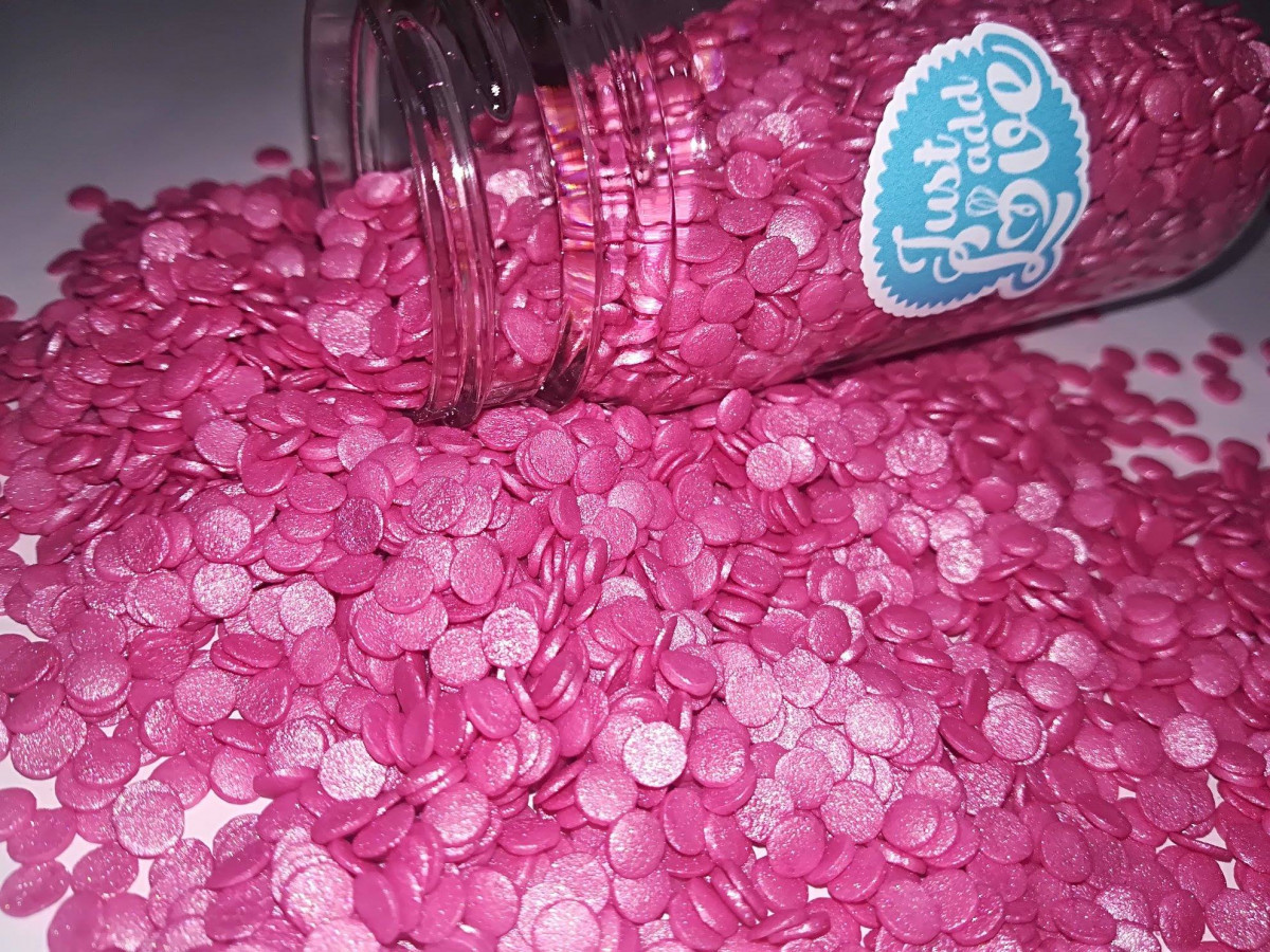 Confettis cor de rosa para decoração de todo o tipo de bolos, de 55g vendido em frasco de rosca.