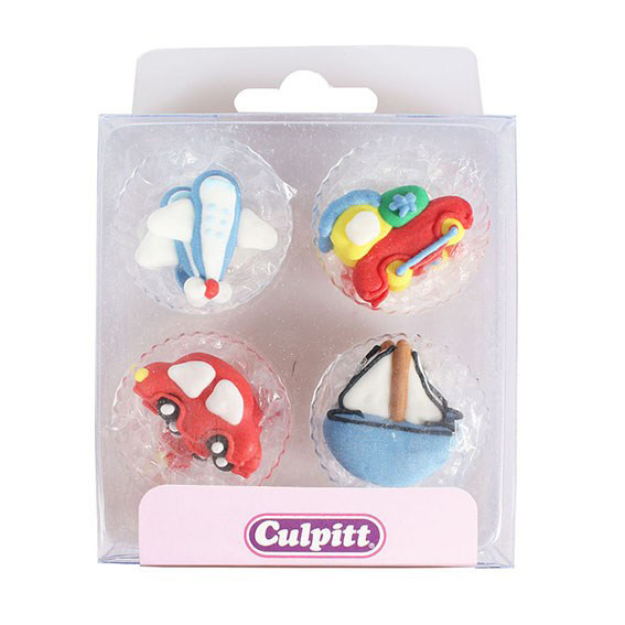 As deliciosas decorações do bolo Sugar inspiradas nos Transportes são individualmente separadas usando glacê real.