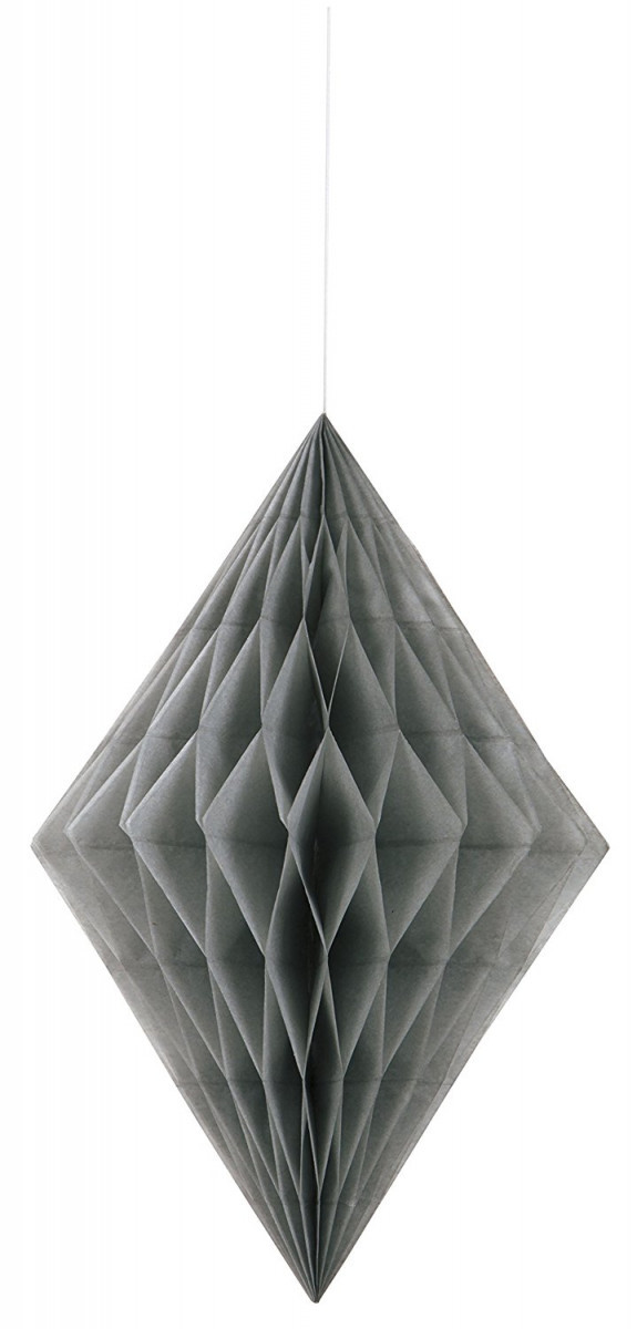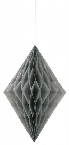 1 diamante de papel seda decorativo em tom de prateado, com 35cm de altura.