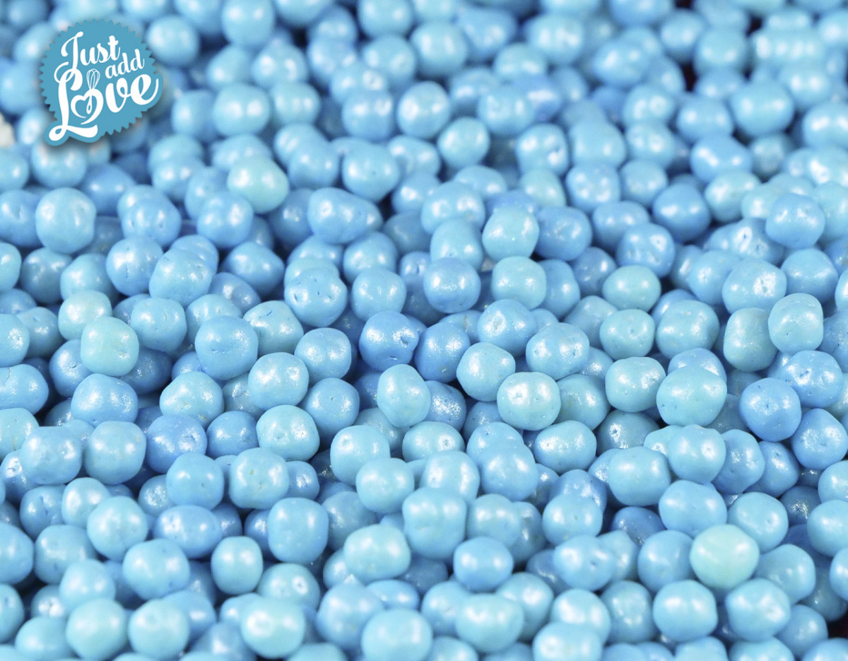 Decoração para todo o tipo de bolos. Embalagem de esferas azuis de 4mm de 100gramas.