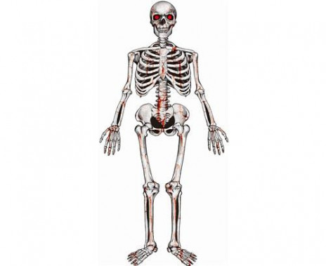 Elementos feitos de papel, impressos com imagens reais de ossos manchados de sangue.