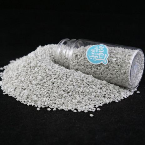 Composição: açúcar, amido de batata, óleo de girassol, farinha de arroz, corante: E153,E171 e agente de revestimento.