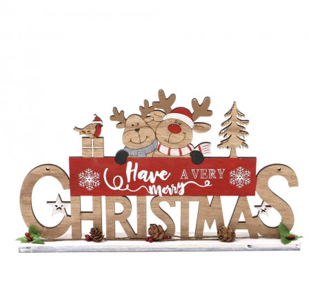Um centro de mesa e/ou decoração de natal em madeira com a inscrição "Have a Very Merry Christmas" com renas, azevinho, pinhas.