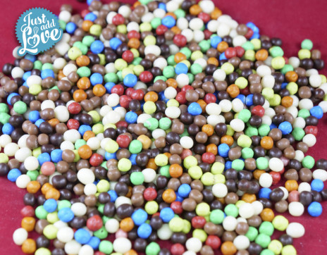Composição: açúcar, amido de trigo, óleo de palma, cera (E904), ácido cítrico (E330), ácido sórbico (E200), dextrose, chocolate branco 45% (açúcar, manteiga de cacau, leite em pó, massa de cacau, soro de leite em pó, manteiga anidra, emulsionante: lecitina de soja, sacarose (sabor de baunilha natural), farinha de arroz, farinha de milho, sal, bolas de arroz 18% (farinha de arroz), glicose, estabilizador E414, corantes (E100, E120, E131, E171, E160a, E120), agentes de revestimento (E905, E903) e goma laca.