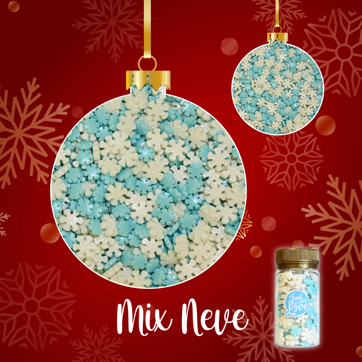 Mistura de flocos de neve 3D nas cores branca e azul claro, para decoração de bolos, bolachas, cakepops, donuts, sobremesas e outras. Frasco com 60 gramas.
