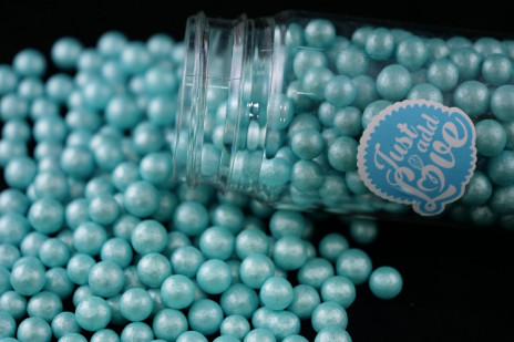 Pérolas na cor azul claro para decoração de todo o tipo de bolos, de 70g vendido em frasco de rosca.