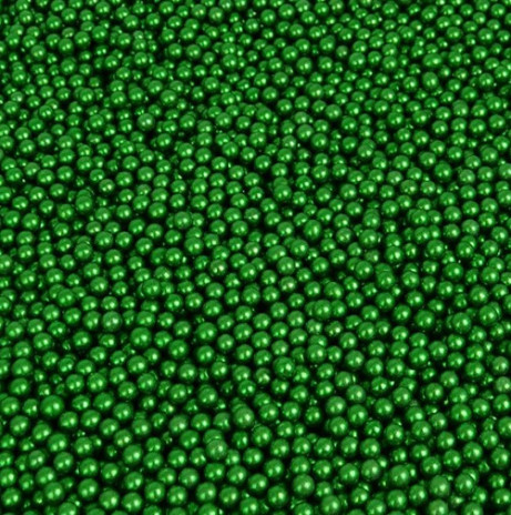 Decoração para todo o tipo de bolos, umas pérolas metalizadas em verde com 7mm, em embalagem de 65g. Cores vibrantes e intensas para decoração de bolos de natal.