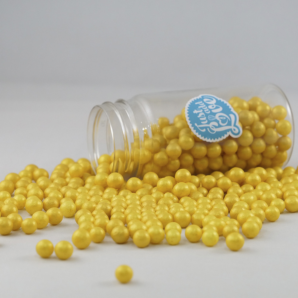Pérolas grandes, de 8mm, na cor ouro para decoração de todo o tipo de bolos, de 70g vendido em frasco de rosca.
