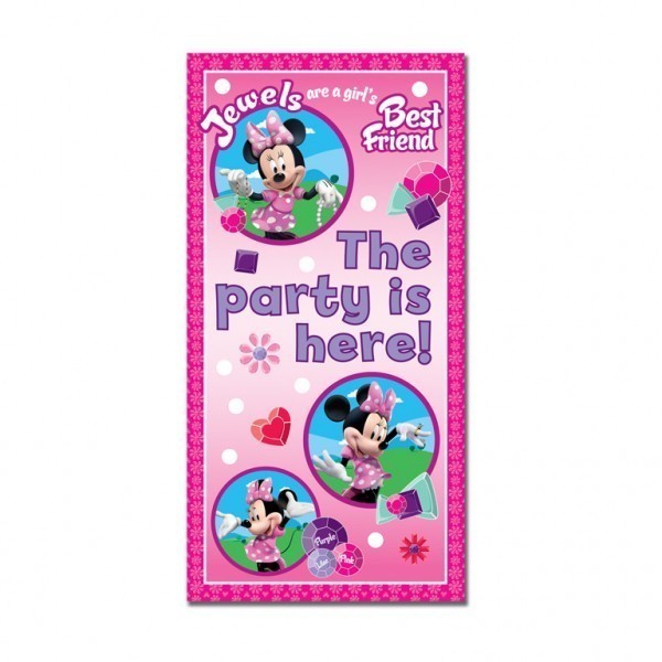 Sinalizador de festa com a personagem Minnie Mouse com a indicação "The Party is Here!"