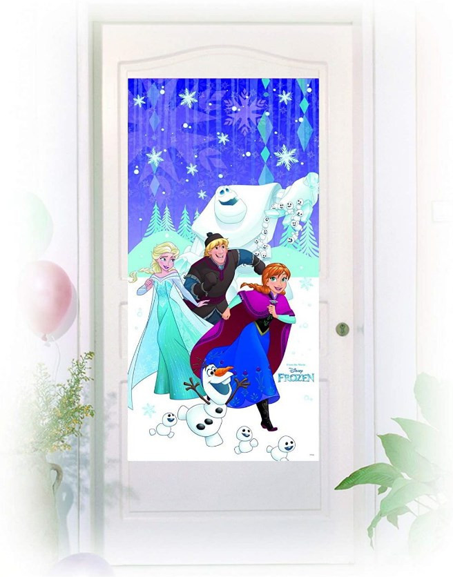 Decoração de porta para festa de aniversário da Frozen da Disney com as personagens principais do filme.