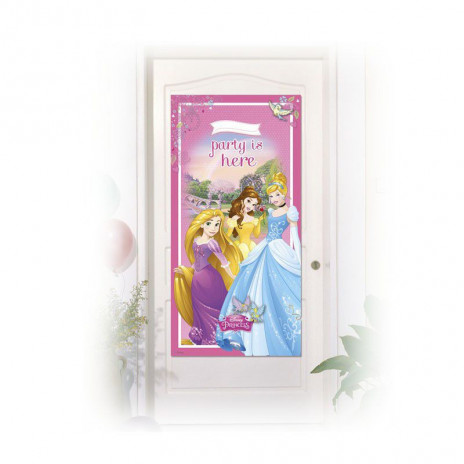 Decoração de porta para festa de aniversário das Princesas da Disney com a inscrição "Party is here".