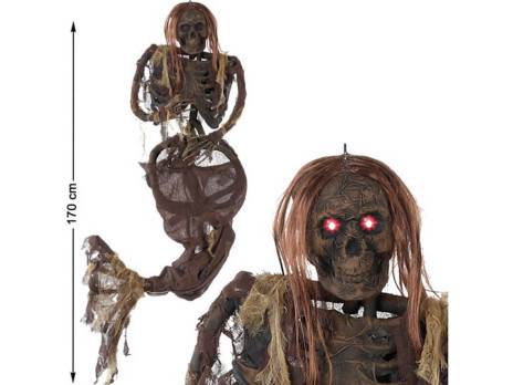Esqueleto de sereia decorativo de halloween com luz nos olhos. Isto sim, vai-te deixar pálido com o susto! Conta com efeitos de luz que lhe dão um aspeto ainda mais aterrador. É um grande elemento decorativo para a festa de halloween.