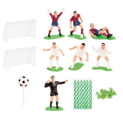 Decorações para bolo de aniversário com tema futebol composto por 2 balizas, 6 jogadores, 1 árbitro, 1 bola e 10 velas.